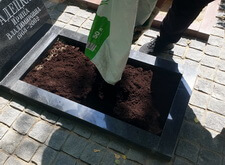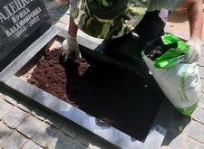 Следующим этапом было облагораживание цветников. Мы заполнили их грунтом, который сразу же опрыскали удобрениями. Это позволило практически сразу же получить зеленеющую траву на могилах.